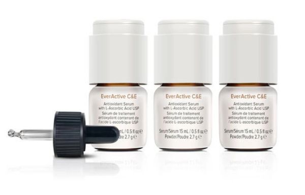 An award-winning, high-strength vitamin C and vitamin E serum that reduces the appearance of fine lines and wrinkles, revitalizing skin. The antioxidants, vitamin C and vitamin E, neutralize free radicals while vitamin C and MATRIXYL® Synthe'6® strengthen and brighten skin. Many vitamin C serums oxidize in their bottles, turning a brownish colour while they are on the shelf or at home. When oxidized, the vitamin C is no longer beneficial to the skin. EverActive C&E™ + Peptide stays fresh because you only mix the 15% vitamin C into the serum when you’re ready to use it.